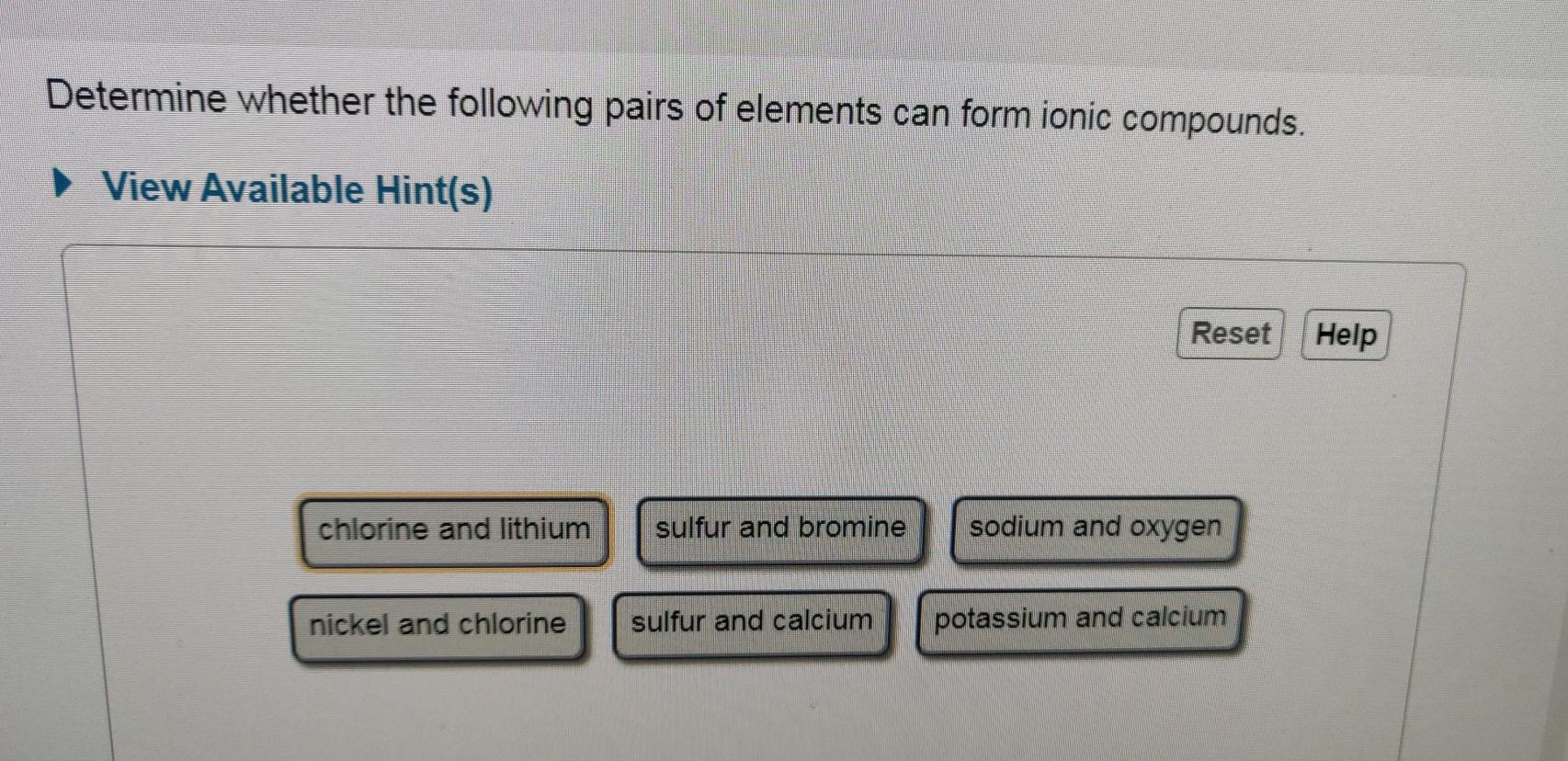 Solved Determine Whether The Following Pairs Of Elements Can Form Ionic Compounds Vlew Avallable Hint S Aeset Help Form Ionic Bonds Do Not Form Ionic Bonds Iron And Chlorine Chlorine And Iithium Potassium And